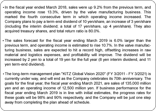 As the fiscal year ending March 2019 has just begun, it may be somewhat early to mention, but the fiscal year ending March 2020 will bring the final goal of the long-term management plan "KITZ Global Vision 2020" into sight. In the fiscal year ending March 2021, the 70th anniversary of the Company's founding, sales and profit targets are sales of 135,000 million yen and an operating income of 12,500 million yen. Based on actual results for the fiscal year ended March 2018, progress rates are 92% and 81%, respectively. If business performance for the fiscal year ending March 2019 is in line with initial estimates, the progress rates will rise to 98% and 90% respectively, and from there it will be just one step away from reaching the goal. It seems possible to achieve the long-term business plan ahead of schedule.