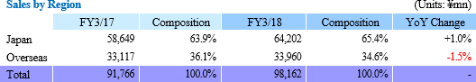 Domestic sales increased 9.5% (5,552 million yen) year on year to 64,202 million yen, and overseas sales grew 2.5% (843 million yen) year on year to 33,960 million yen, but in real terms, overseas sales dropped due to a 944 million yen increase by foreign exchange fluctuations.
