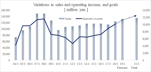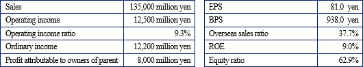 The 3rd Medium-term Management Plan (FY 3/2017 - FY 3/2019) is currently under way. The 3rd Medium-term Management Plan has 4 basic policies: (1) Achieve operating income in excess of 10,000 million yen in the fiscal year ending March 2019 (and a record 12,500 million yen in the fiscal year ending March 2021, the final year of the long-term management plan). (2) Thoroughly focus on profit and cash flow and achieve an ROE of 8% or more, (3) Concentrate management resources in key areas of the market where strengths can be utilized, and (4) Improve return to shareholders.