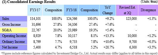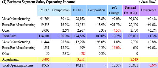 Sales were 124,566 million yen, up 9.2% year on year. The sales consisted of 98,162 million yen (+0.4% from the estimate), up 7.0% year on year from the valve manufacturing business, and 23,535 million yen (+4.6% from the estimate), up 21.7% year on year from the brass bar manufacturing business. The ratio of overseas sales was 27.9%, down 1.8 points (it was 29.7% in FY 3/2017).