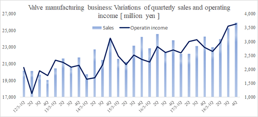 In the fiscal year ending March 2019, sales for the valve manufacturing business are expected to hit record highs. The business environment in regards to redevelopment in the Tokyo metropolitan area and Olympic-related business was favorable in Japan, and as for overseas business, sales for semiconductor manufacturing equipment are strong, and ASEAN countries and North America are on a recovery trend. In domestic market, the Company carried out price revisions for the second consecutive year. As many competitors raised the price this year, following KITZ, customers will understand the background and accept price revision. The new prices are expected to penetrate in the market during the term's second half.