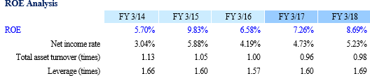 *ROE (Return on equity) is obtained by multiplying "net income rate (net income ÷ sales)," "total asset turnover (sales ÷ total assets)," and "leverage (total assets ÷ equity capital, or the reciprocal of capital-to-asset ratio)." ROE = Net Income Rate × Total Asset Turnover × Leverage
